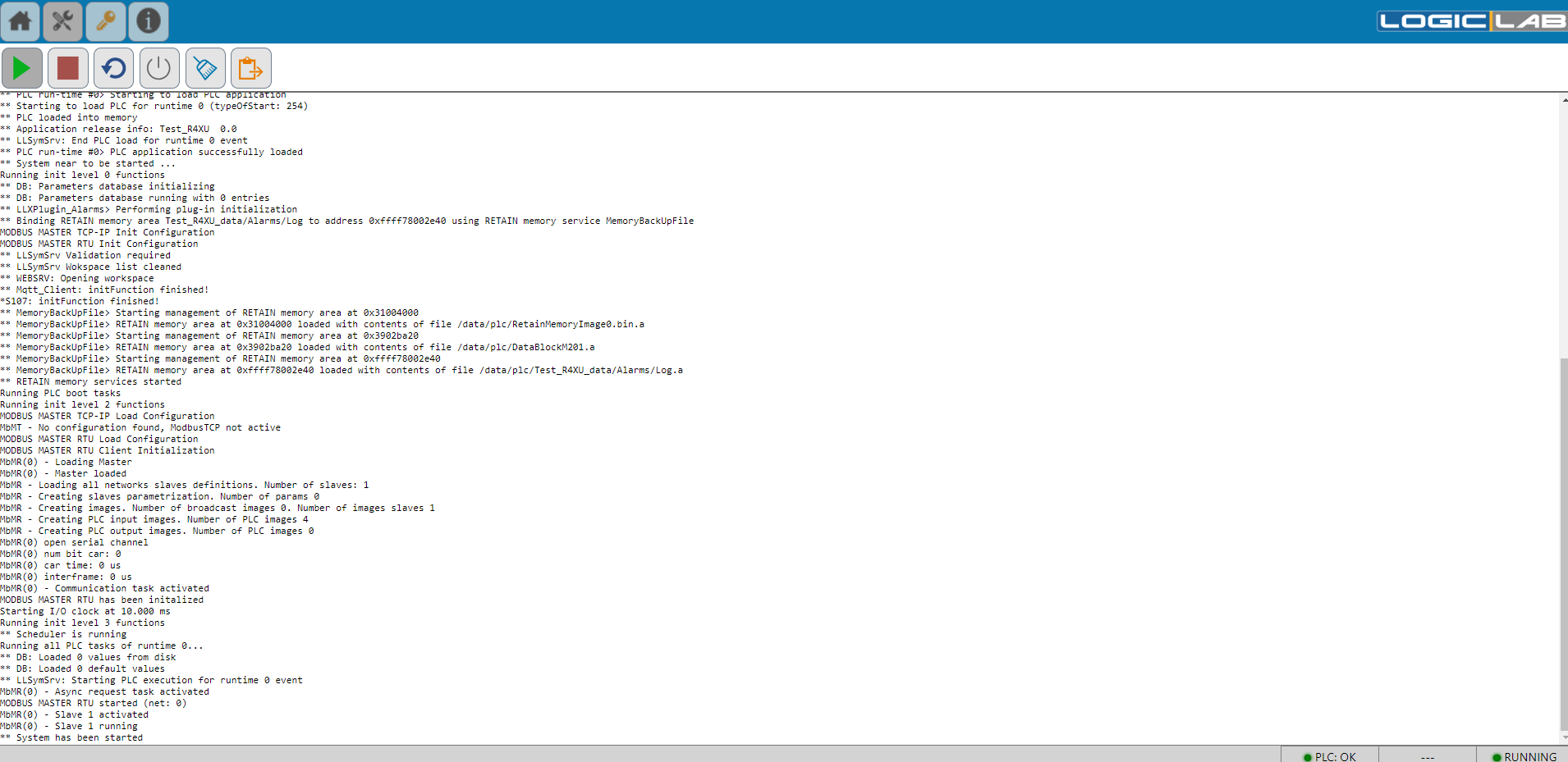In questa pagina sono presenti i log del runtime che esegue il programma PLC. Da qui si può monitorare se tutti i processi girano in maniera corretta o se ci sono errori di vario genere.