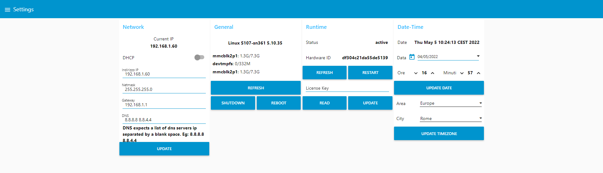 Nella sezione "Runtime" sono presenti lo stato e l'ID hardware. È quindi possibile riavviare o refreshare il processo. Al di sotto troviamo la "license key", necessaria per l'attivazione. Con i pulsanti READ e UPDATE si può visualizzarla o modificarla.